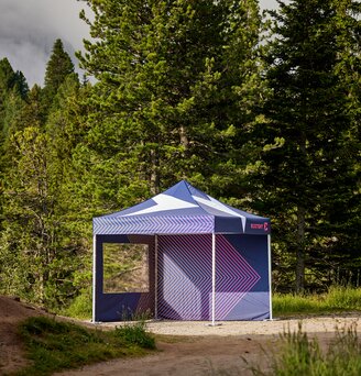 Ready in just 60 seconds, 100% waterproof and UV resistant. Wind-stable up to 100 km/h and fully customisable with print – manufactured in Europe to the highest quality standards.